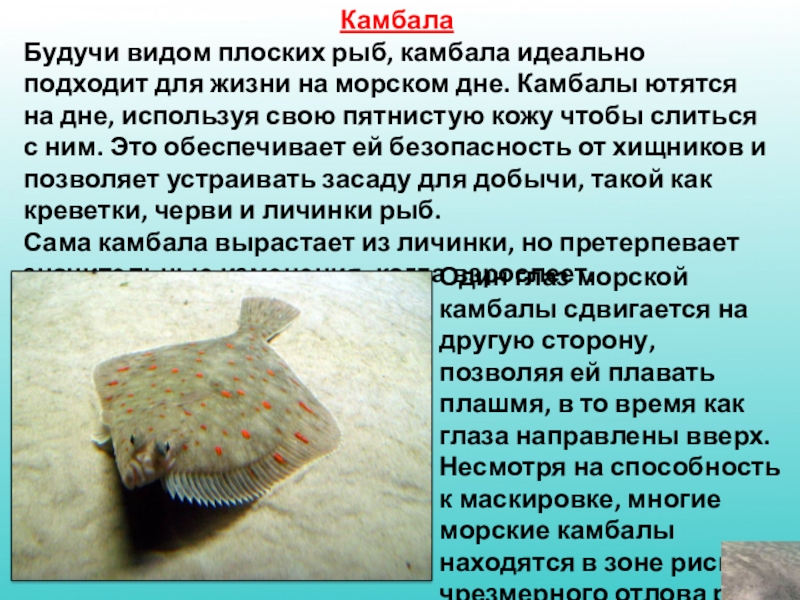 Один глаз морской камбалы сдвигается на другую сторону, позволяя ей плавать плашмя, в то время как глаза направлены вверх. Несмотря на способность к маскировке, многие морские камбалы находятся в зоне риска от чрезмерного отлова рыб.