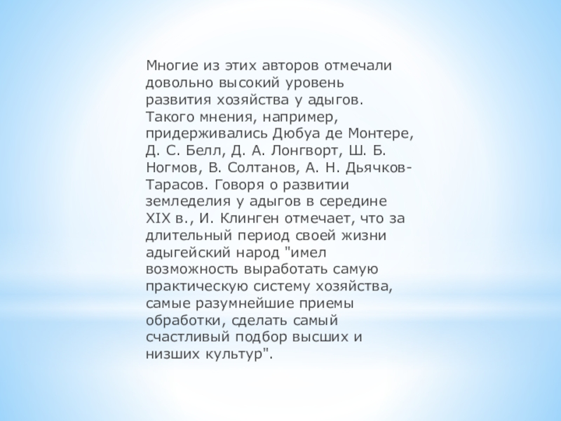 адыгов. Такого мнения, например, придерживались Дюбуа де Монтере, Д. С. Белл, Д. А. Лонгворт, Ш. Б. Ногмов, В. Солтанов, А. Н. Дьячков-Тарасов. Говоря о развитии земледелия у адыгов в середине ХІХ в., И. Клинген отмечает, что за длительный период своей жизни адыгейский народ "имел возможность выработать самую практическую систему хозяйства, самые разумнейшие приемы обработки, сделать самый счастливый подбор высших и низших культур".