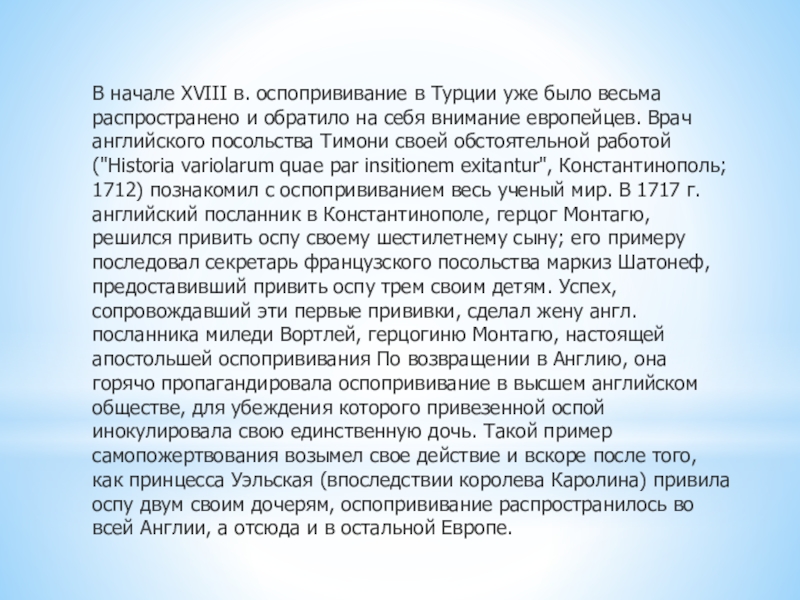 и обратило на себя внимание европейцев. Врач английского посольства Тимони своей обстоятельной работой ("Historia variolarum quae par insitionem exitantur", Константинополь; 1712) познакомил с оспопрививанием весь ученый мир. В 1717 г. английский посланник в Константинополе, герцог Монтагю, решился привить оспу своему шестилетнему сыну; его примеру последовал секретарь французского посольства маркиз Шатонеф, предоставивший привить оспу трем своим детям. Успех, сопровождавший эти первые прививки, сделал жену англ. посланника миледи Вортлей, герцогиню Монтагю, настоящей апостольшей оспопрививания По возвращении в Англию, она горячо пропагандировала оспопрививание в высшем английском обществе, для убеждения которого привезенной оспой инокулировала свою единственную дочь. Такой пример самопожертвования возымел свое действие и вскоре после того, как принцесса Уэльская (впоследствии королева Каролина) привила оспу двум своим дочерям, оспопрививание распространилось во всей Англии, а отсюда и в остальной Европе.