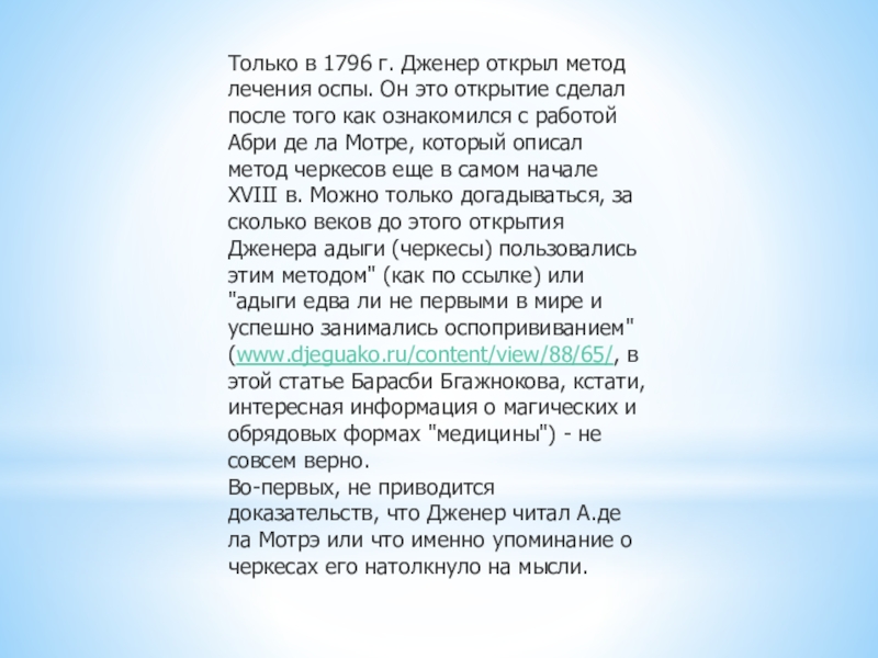 открытие сделал после того как ознакомился с работой Абри де ла Мотре, который описал метод черкесов еще в самом начале XVIII в. Можно только догадываться, за сколько веков до этого открытия Дженера адыги (черкесы) пользовались этим методом" (как по ссылке) или "адыги едва ли не первыми в мире и успешно занимались оспопрививанием" (www.djeguako.ru/content/view/88/65/, в этой статье Барасби Бгажнокова, кстати, интересная информация о магических и обрядовых формах "медицины") - не совсем верно.
