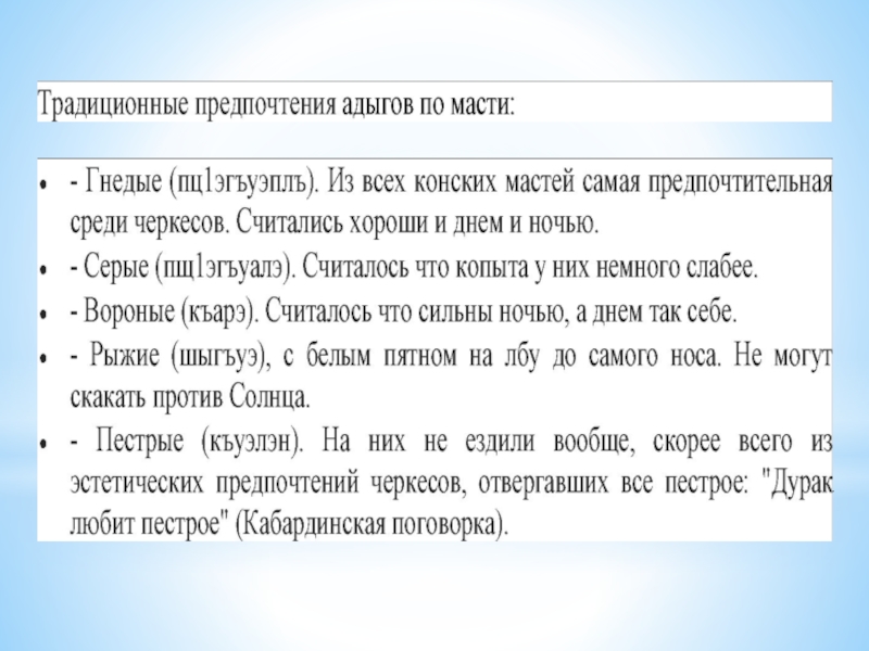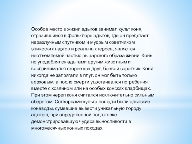 Слайд 31Особое место в жизни адыгов занимал культ коня, отразившийся в фольклоре