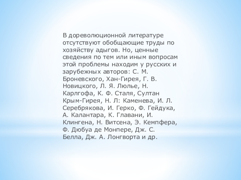 Слайд 28В дореволюционной литературе отсутствуют обобщающие труды по хозяйству адыгов. Но, ценные