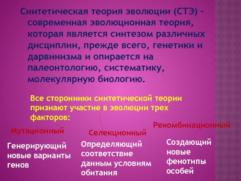 Все сторонники синтетической теории признают участие в эволюции трех факторов:
