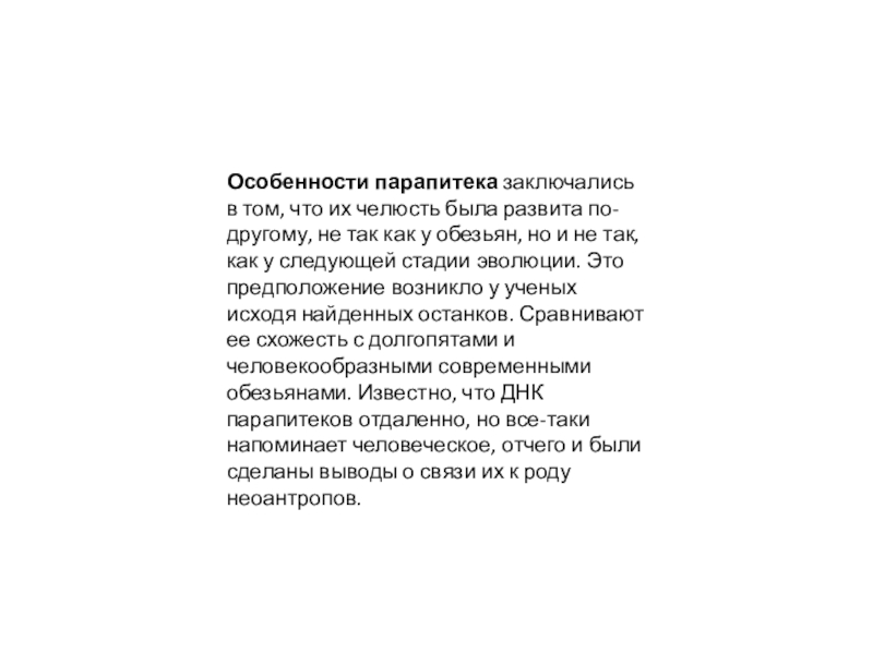 так как у обезьян, но и не так, как у следующей стадии эволюции. Это предположение возникло у ученых исходя найденных останков. Сравнивают ее схожесть с долгопятами и человекообразными современными обезьянами. Известно, что ДНК парапитеков отдаленно, но все-таки напоминает человеческое, отчего и были сделаны выводы о связи их к роду неоантропов.