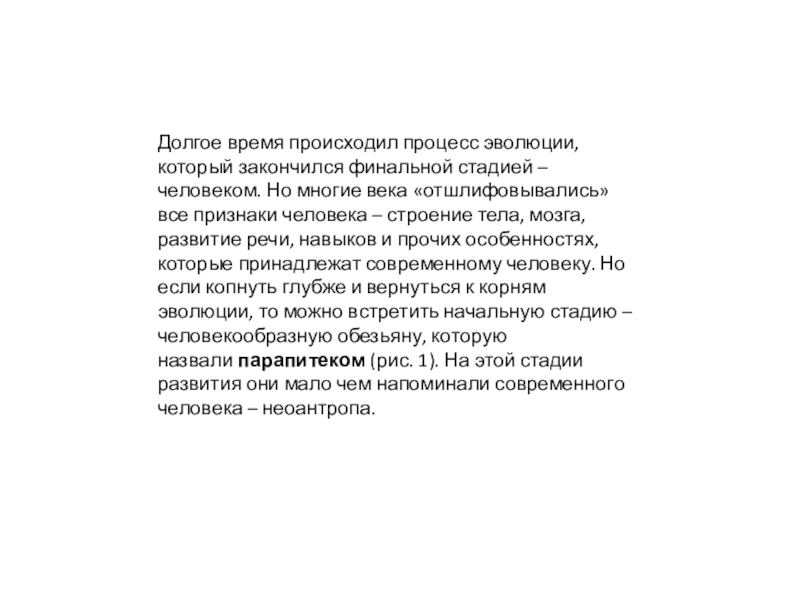 Слайд 3Долгое время происходил процесс эволюции, который закончился финальной стадией – человеком.