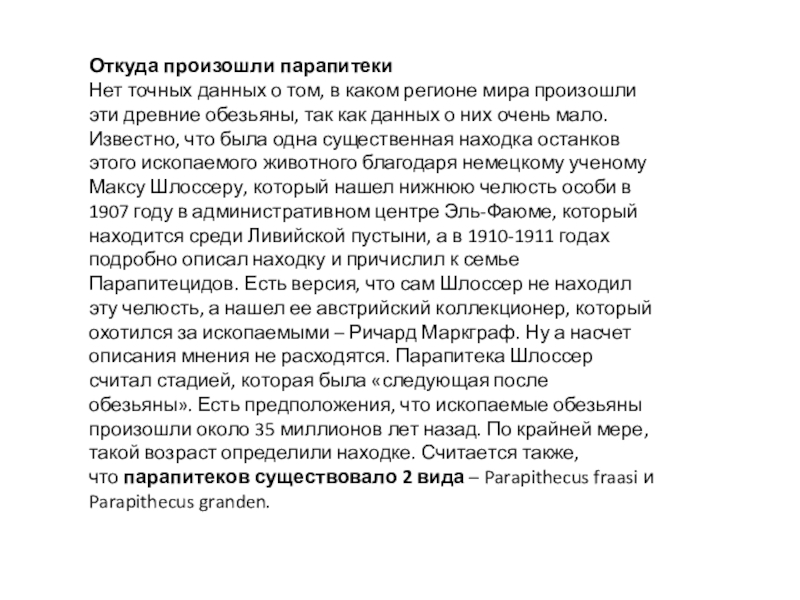 произошли эти древние обезьяны, так как данных о них очень мало. Известно, что была одна существенная находка останков этого ископаемого животного благодаря немецкому ученому Максу Шлоссеру, который нашел нижнюю челюсть особи в 1907 году в административном центре Эль-Фаюме, который находится среди Ливийской пустыни, а в 1910-1911 годах подробно описал находку и причислил к семье Парапитецидов. Есть версия, что сам Шлоссер не находил эту челюсть, а нашел ее австрийский коллекционер, который охотился за ископаемыми – Ричард Маркграф. Ну а насчет описания мнения не расходятся. Парапитека Шлоссер считал стадией, которая была «следующая после обезьяны». Есть предположения, что ископаемые обезьяны произошли около 35 миллионов лет назад. По крайней мере, такой возраст определили находке. Считается также, что парапитеков существовало 2 вида – Parapithecus fraasi и Parapithecus granden.