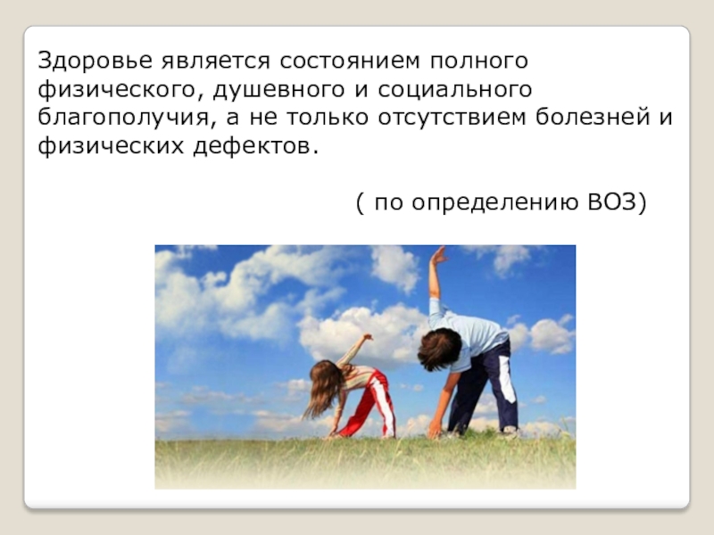 Здоровье является состоянием полного физического, душевного и социального благополучия, а не только отсутствием болезней и физических дефектов.