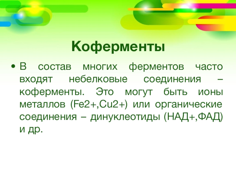 КоферментыВ состав многих ферментов часто входят небелковые соединения – коферменты. Это могут быть ионы металлов (Fe2+,Cu2+) или