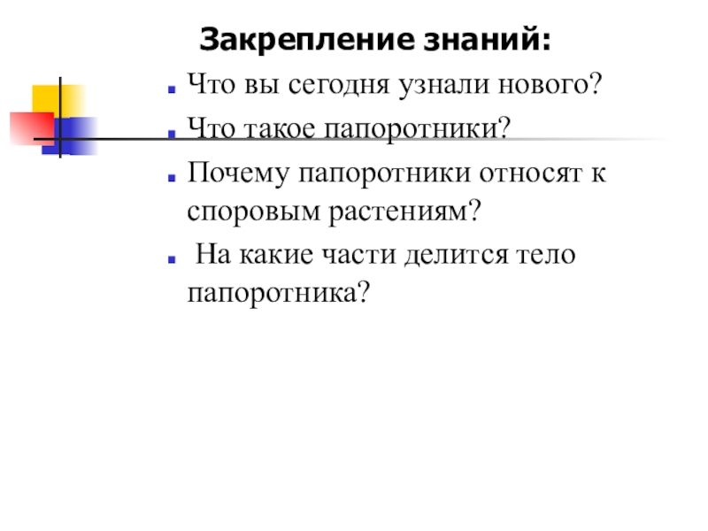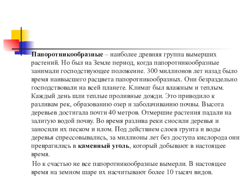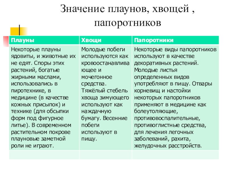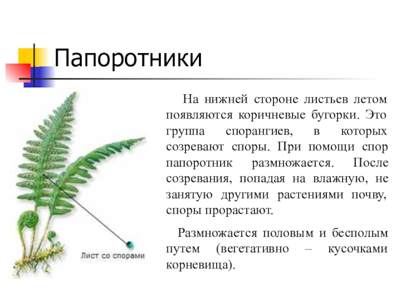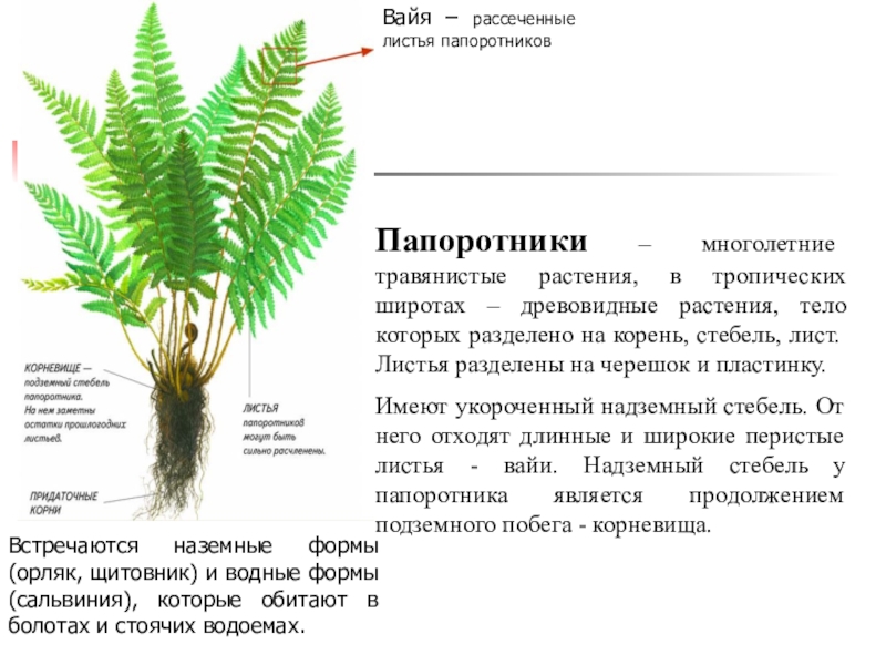 Встречаются наземные формы (орляк, щитовник) и водные формы (сальвиния), которые обитают в болотах и стоячих водоемах.