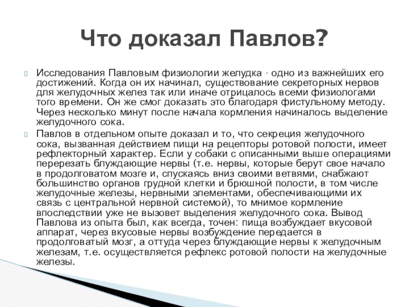 Павлов в отдельном опыте доказал и то, что секреция желудочного сока, вызванная действием пищи на рецепторы ротовой полости, имеет рефлекторный характер. Если у собаки с описанными выше операциями перерезать блуждающие нервы (т.е. нервы, которые берут свое начало в продолговатом мозге и, спускаясь вниз своими ветвями, снабжают большинство органов грудной клетки и брюшной полости, в том числе желудочные железы, нервными элементами, обеспечивающими их связь с центральной нервной системой), то мнимое кормление впоследствии уже не вызовет выделения желудочного сока. Вывод Павлова из опыта был, как всегда, точен: пища возбуждает вкусовой аппарат, через вкусовые нервы возбуждение передается в продолговатый мозг, а оттуда через блуждающие нервы к желудочным железам, т.е. осуществляется рефлекс ротовой полости на желудочные железы.