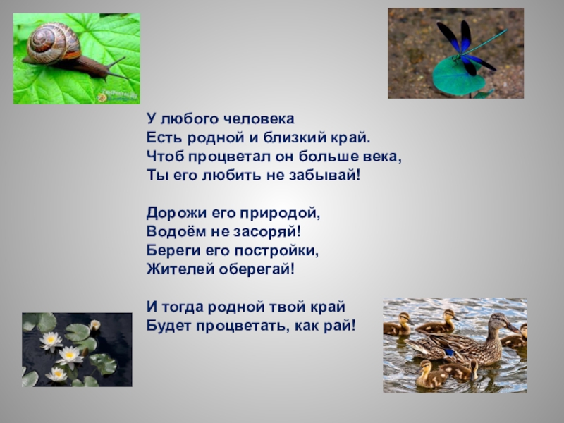 его любить не забывай!   Дорожи его природой, Водоём не засоряй! Береги его постройки, Жителей оберегай!   И тогда родной твой край Будет процветать, как рай!