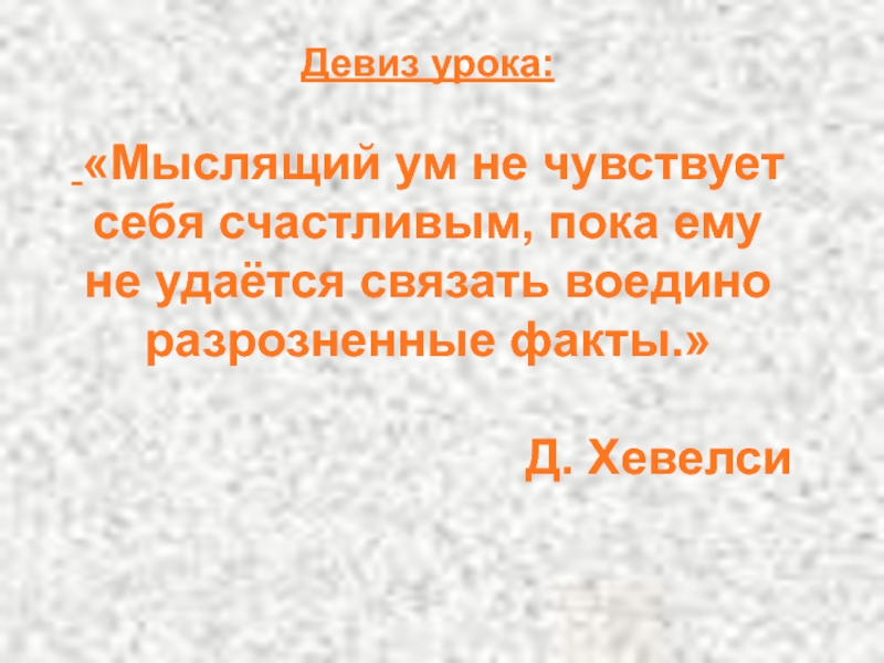 Девиз урока: «Мыслящий ум не чувствует себя счастливым, пока ему не удаётся связать воедино разрозненные факты.» Д. Хевелси