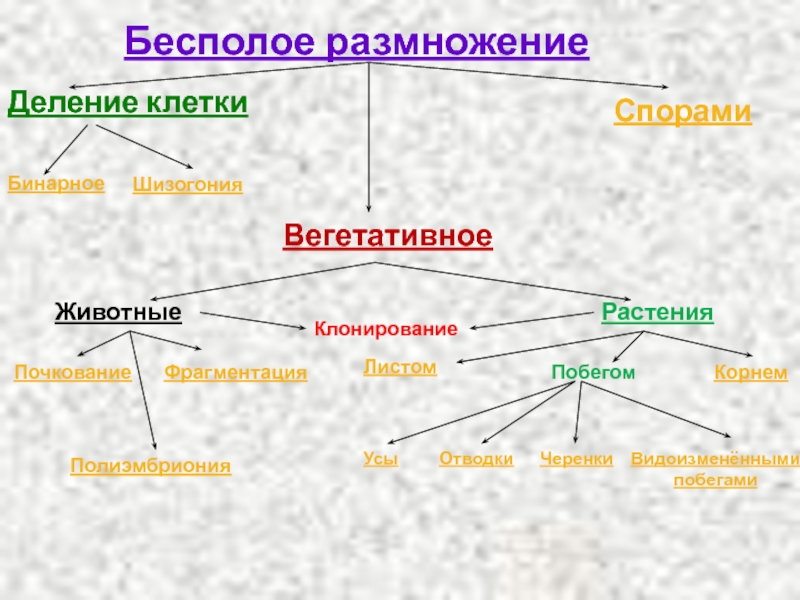 Бесполое размножениеДеление клеткиСпорамиБинарноеШизогонияВегетативноеЖивотныеРастенияПочкованиеФрагментацияПолиэмбрионияЛистомПобегомКорнемКлонированиеУсыОтводкиЧеренкиВидоизменёнными побегами