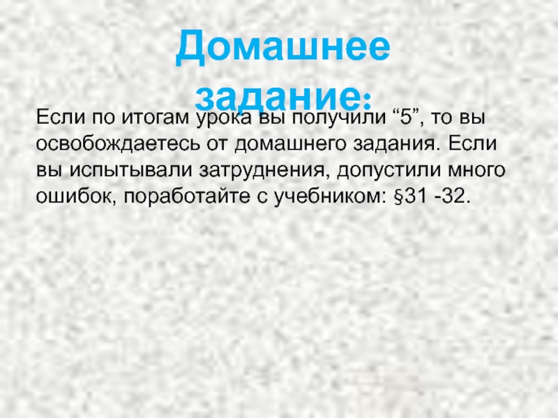 Домашнее задание:Если по итогам урока вы получили “5”, то вы освобождаетесь от домашнего задания. Если вы испытывали