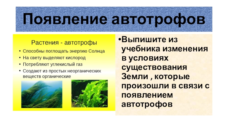 Появление автотрофовВыпишите из учебника изменения в условиях существования Земли , которые произошли в связи с появлением автотрофов