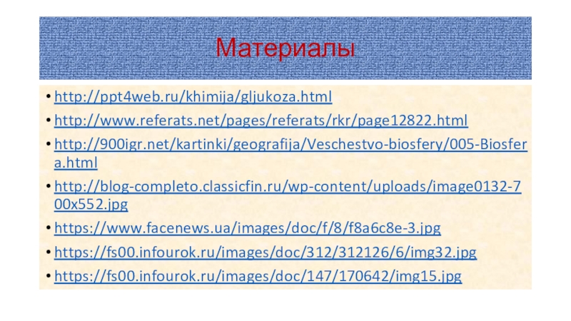 Материалыhttp://ppt4web.ru/khimija/gljukoza.htmlhttp://www.referats.net/pages/referats/rkr/page12822.htmlhttp://900igr.net/kartinki/geografija/Veschestvo-biosfery/005-Biosfera.htmlhttp://blog-completo.classicfin.ru/wp-content/uploads/image0132-700x552.jpghttps://www.facenews.ua/images/doc/f/8/f8a6c8e-3.jpghttps://fs00.infourok.ru/images/doc/312/312126/6/img32.jpghttps://fs00.infourok.ru/images/doc/147/170642/img15.jpg