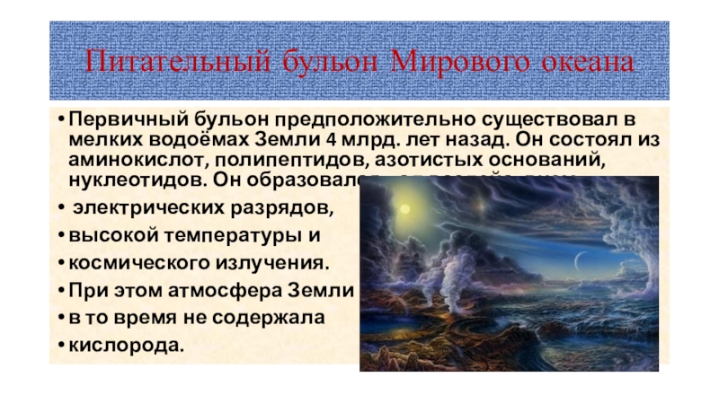 Питательный бульон Мирового океанаПервичный бульон предположительно существовал в мелких водоёмах Земли 4 млрд. лет назад. Он состоял