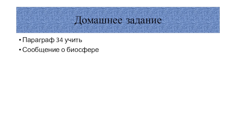 Домашнее заданиеПараграф 34 учить Сообщение о биосфере