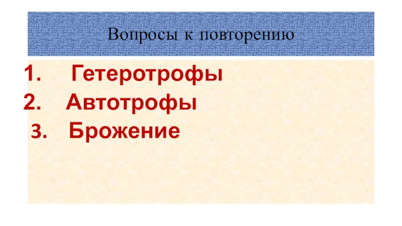 Вопросы к повторению Гетеротрофы Автотрофы3. Брожение