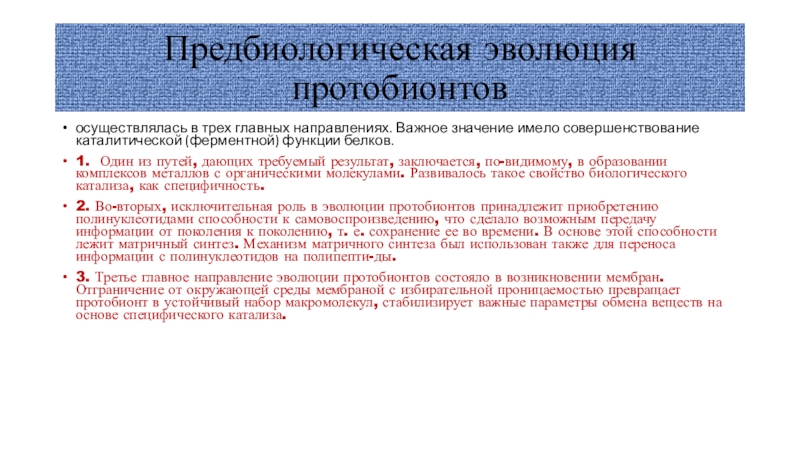 Предбиологическая эволюция протобионтов осуществлялась в трех главных направлениях. Важное значение имело совершенствование каталитической (ферментной) функции белков.1. Один