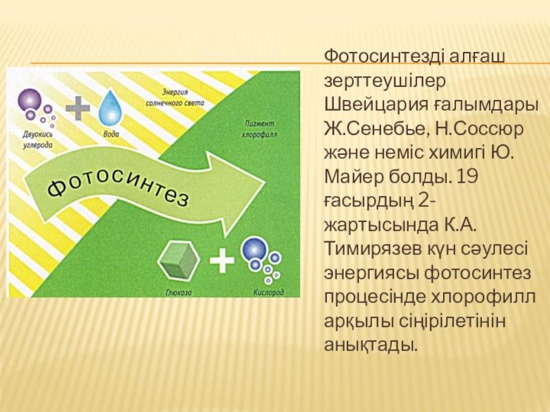 Слайд 3Фотосинтезді алғаш зерттеушілер Швейцария ғалымдары Ж.Сенебье, Н.Соссюр және неміс химигі Ю.Майер