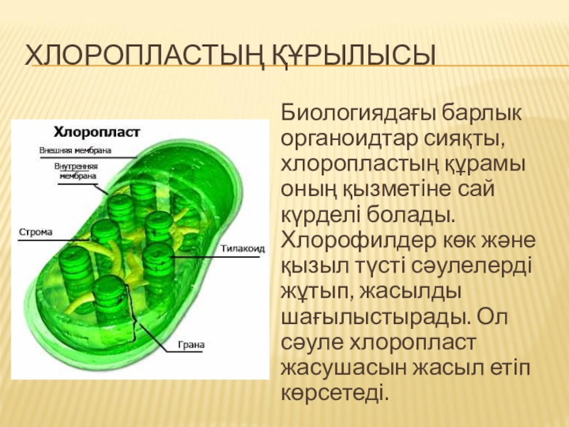 ХЛОРОПЛАСТЫҢ ҚҰРЫЛЫСЫБиологиядағы барлык органоидтар сияқты, хлоропластың құрамы оның қызметiне сай күрделi болады. Хлорофилдер көк және қызыл түсті