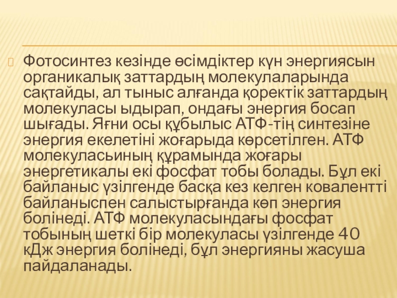 Слайд 11Фотосинтез кезiнде өсiмдiктер күн энергиясын органикалық заттардың молекулаларында сақтайды, ал тыныс
