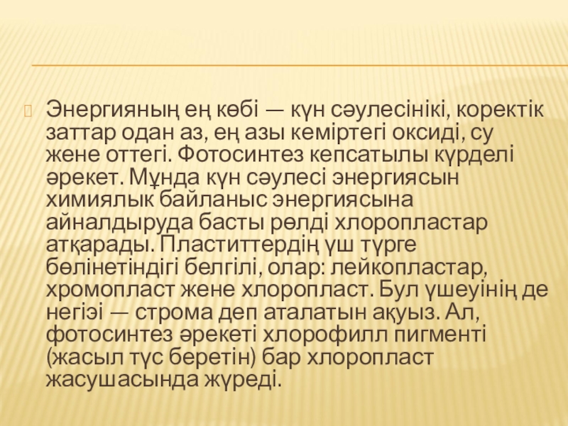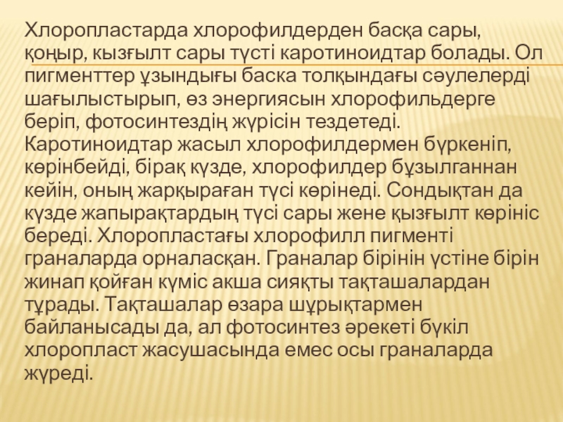 Слайд 8Хлоропластарда хлорофилдерден басқа сары, қоңыр, кызғылт сары түстi каротиноидтар болады. Ол