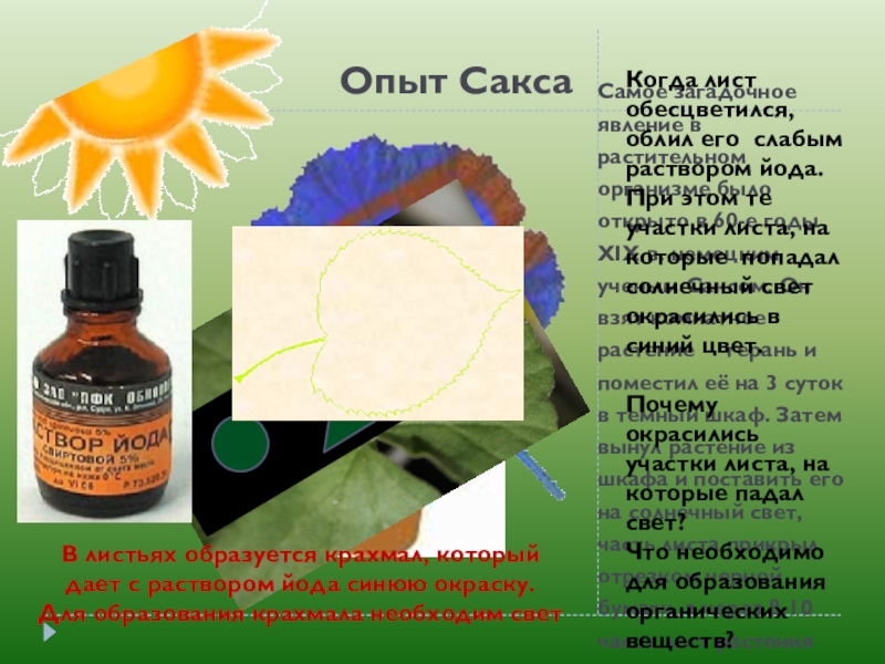 Когда лист обесцветился, облил его слабым раствором йода. При этом те участки листа, на которые попадал солнечный свет окрасились в синий цвет.