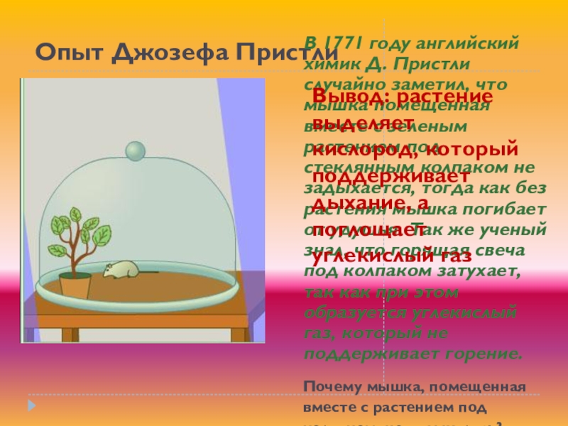Вывод: растение выделяет кислород, который поддерживает дыхание, а поглощает углекислый газ