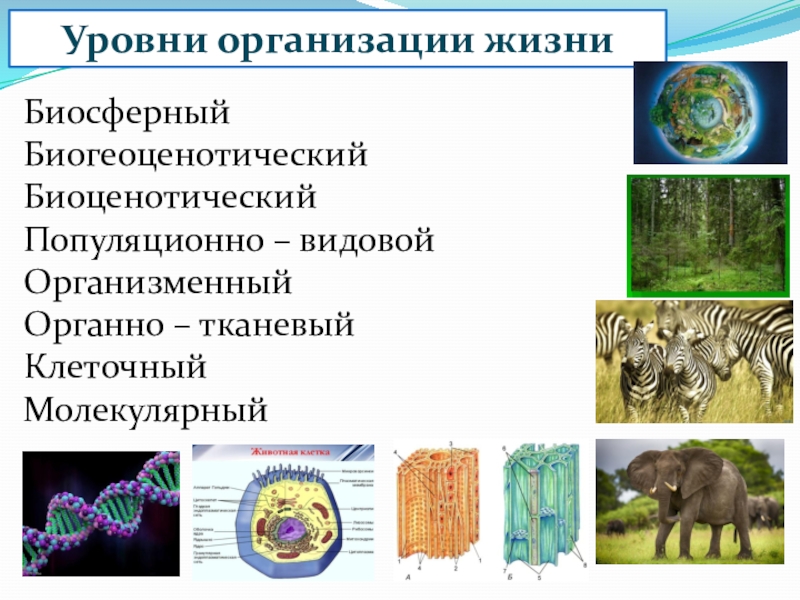 Уровни организации жизниБиосферныйБиогеоценотическийБиоценотическийПопуляционно – видовойОрганизменныйОрганно – тканевыйКлеточный Молекулярный