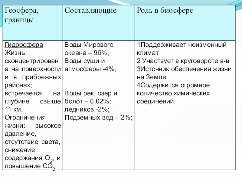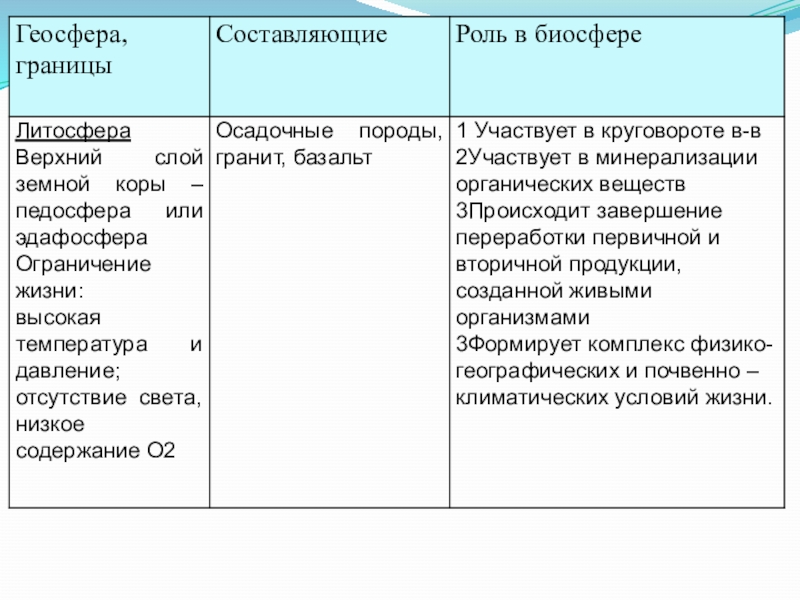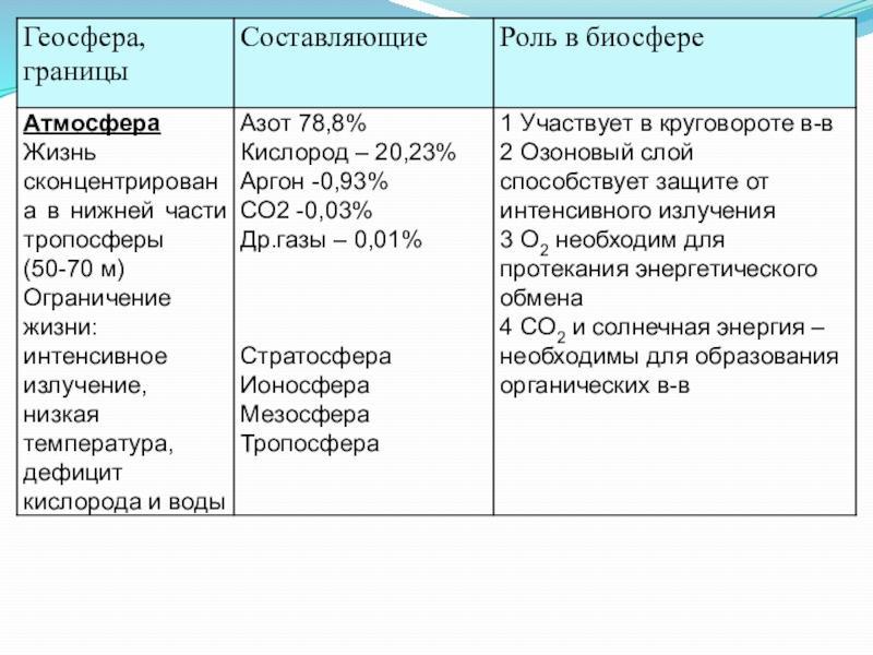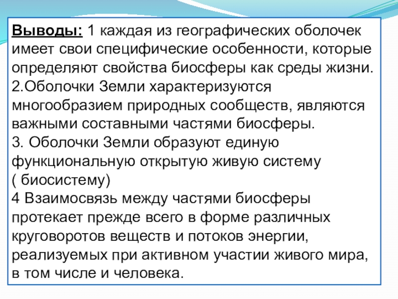 Выводы: 1 каждая из географических оболочек имеет свои специфические особенности, которые определяют свойства биосферы как среды жизни.2.Оболочки