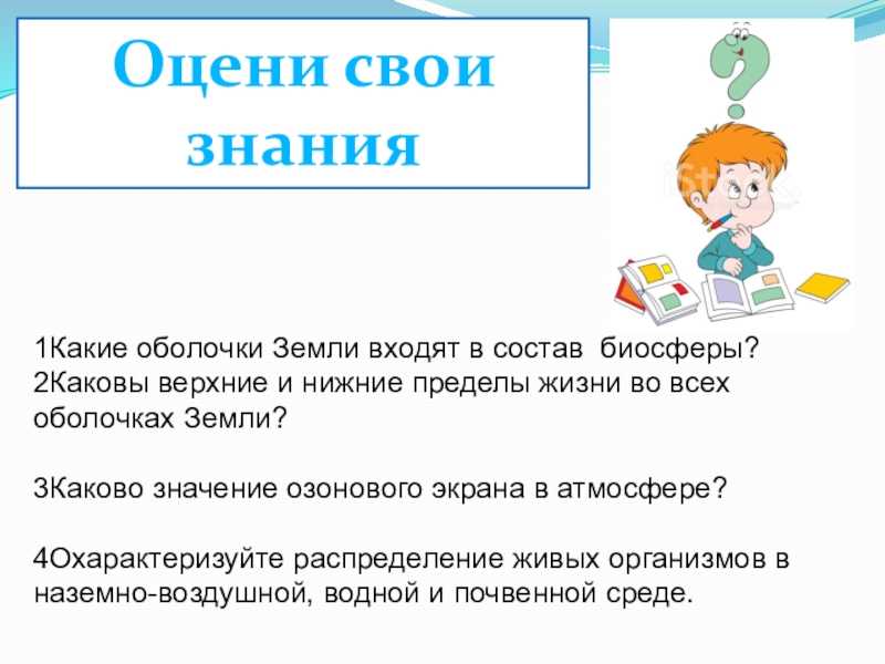 Оцени свои знания1Какие оболочки Земли входят в состав  биосферы?  2Каковы верхние и нижние пределы жизни во всех