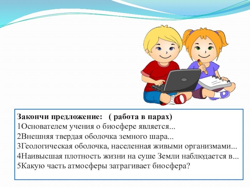 Закончи предложение:  ( работа в парах)1Основателем учения о биосфере является...2Внешняя твердая оболочка земного шара...3Геологическая оболочка, населенная