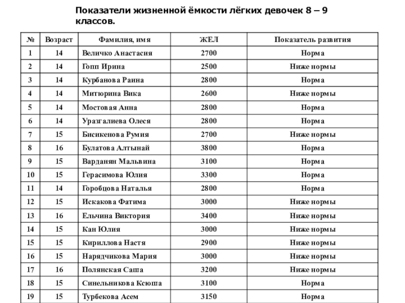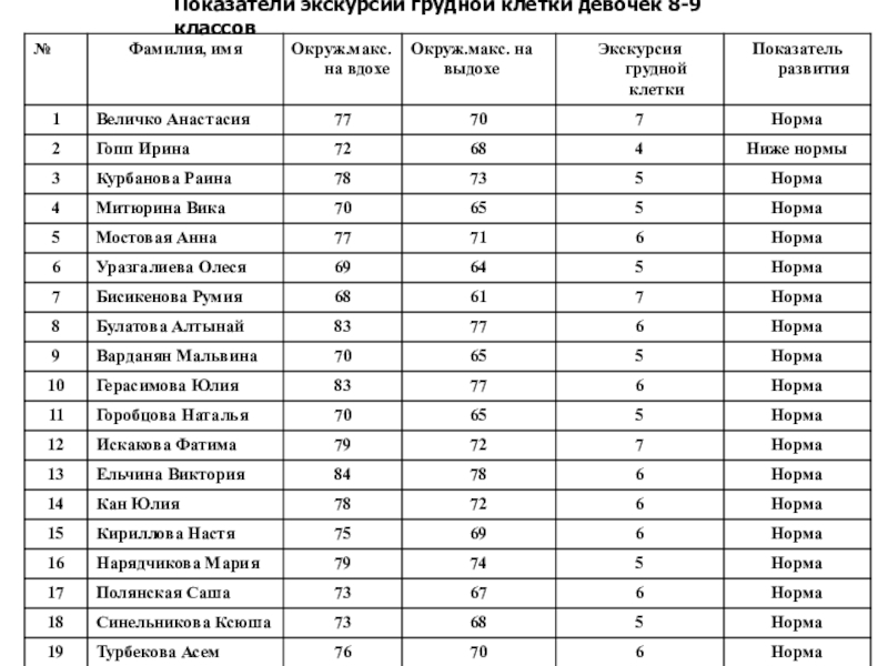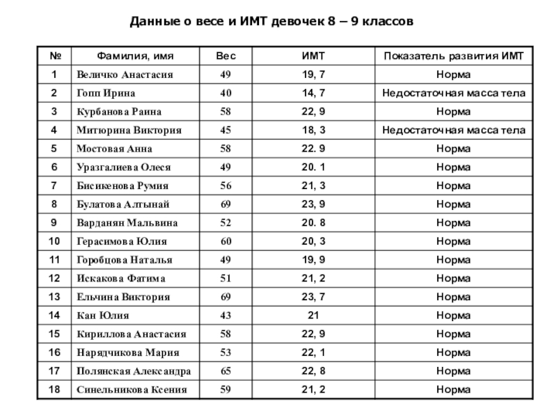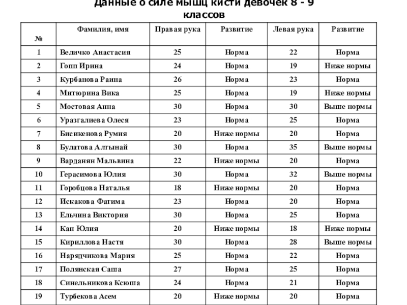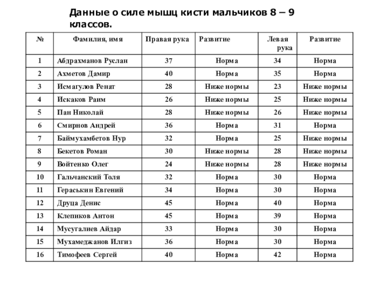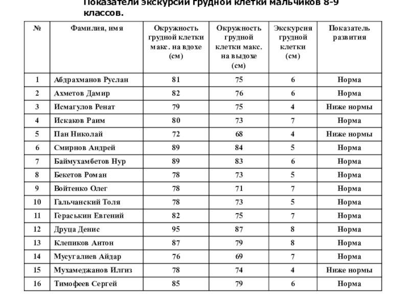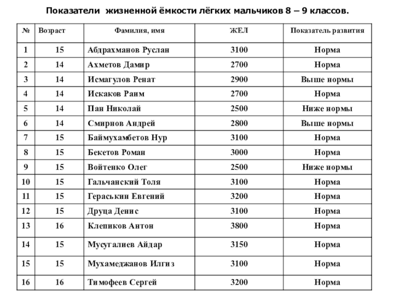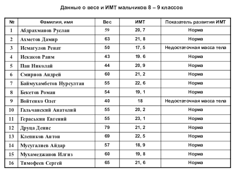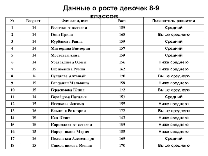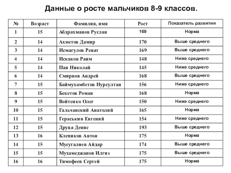 Цель: Определение уровня физического развития мальчиков и девочек 8 и 9 классов