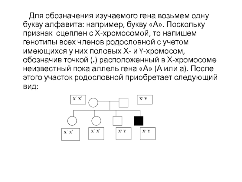 алфавита: например, букву «А». Поскольку признак сцеплен с Х-хромосомой, то напишем генотипы всех членов родословной с учетом имеющихся у них половых Х- и Y-хромосом, обозначив точкой (.) расположенный в Х-хромосоме неизвестный пока аллель гена «А» (А или а). После этого участок родословной приобретает следующий вид: