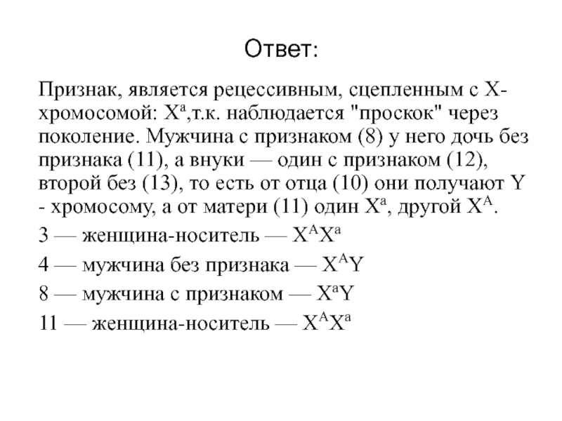 Мужчина с признаком (8) у него дочь без признака (11), а внуки — один с признаком (12), второй без (13), то есть от отца (10) они получают Y - хромосому, а от матери (11) один Ха, другой ХА.