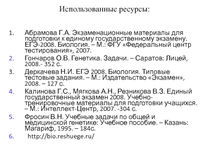 Фросин В.Н. Учебные задачи по общей и медицинской генетике: Учебное пособие. – Казань: Магариф, 1995. – 184с.