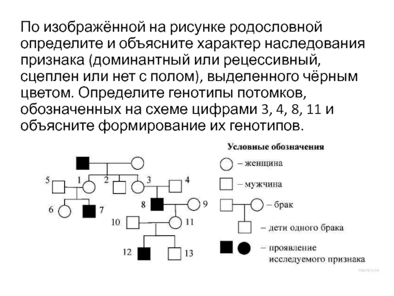 (доминантный или рецессивный, сцеплен или нет с полом), выделенного чёрным цветом. Определите генотипы потомков, обозначенных на схеме цифрами 3, 4, 8, 11 и объясните формирование их генотипов.