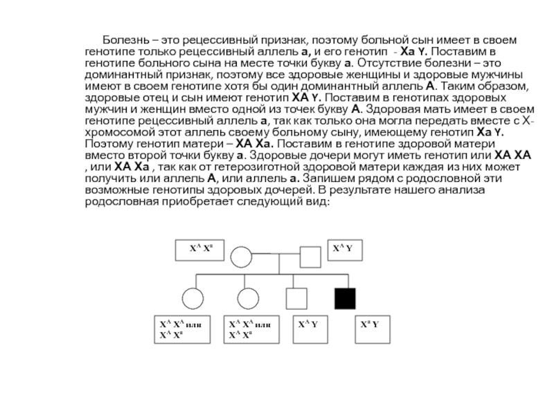 больной сын имеет в своем генотипе только рецессивный аллель а, и его генотип - Ха Y. Поставим в генотипе больного сына на месте точки букву а. Отсутствие болезни – это доминантный признак, поэтому все здоровые женщины и здоровые мужчины имеют в своем генотипе хотя бы один доминантный аллель А. Таким образом, здоровые отец и сын имеют генотип ХА Y. Поставим в генотипах здоровых мужчин и женщин вместо одной из точек букву А. Здоровая мать имеет в своем генотипе рецессивный аллель а, так как только она могла передать вместе с Х-хромосомой этот аллель своему больному сыну, имеющему генотип Ха Y. Поэтому генотип матери – ХА Ха. Поставим в генотипе здоровой матери вместо второй точки букву а. Здоровые дочери могут иметь генотип или ХА ХА , или ХА Ха , так как от гетерозиготной здоровой матери каждая из них может получить или аллель А, или аллель а. Запишем рядом с родословной эти возможные генотипы здоровых дочерей. В результате нашего анализа родословная приобретает следующий вид: