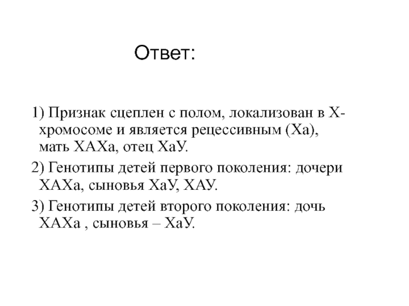 2) Генотипы детей первого поколения: дочери ХАХа, сыновья ХаУ, ХАУ.