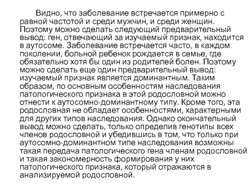 с равной частотой и среди мужчин, и среди женщин. Поэтому можно сделать следующий предварительный вывод: ген, отвечающий за изучаемый признак, находится в аутосоме. Заболевание встречается часто, в каждом поколении, больной ребенок рождается в семье, где обязательно хотя бы один из родителей болен. Поэтому можно сделать еще один предварительный вывод: изучаемый признак является доминантным. Таким образом, по основным особенностям наследования патологического признака в этой родословной можно отнести к аутосомно-доминантному типу. Кроме того, эта родословная не обладает особенностями, характерными для других типов наследования. Однако окончательный вывод можно сделать, только определив генотипы всех членов родословной и убедившись в том, что только при аутосомно-доминантном типе наследования возможны такая передача патологического гена членам родословной и такая закономерность формирования у них патологического признака, который отражаются в анализируемой родословной.
