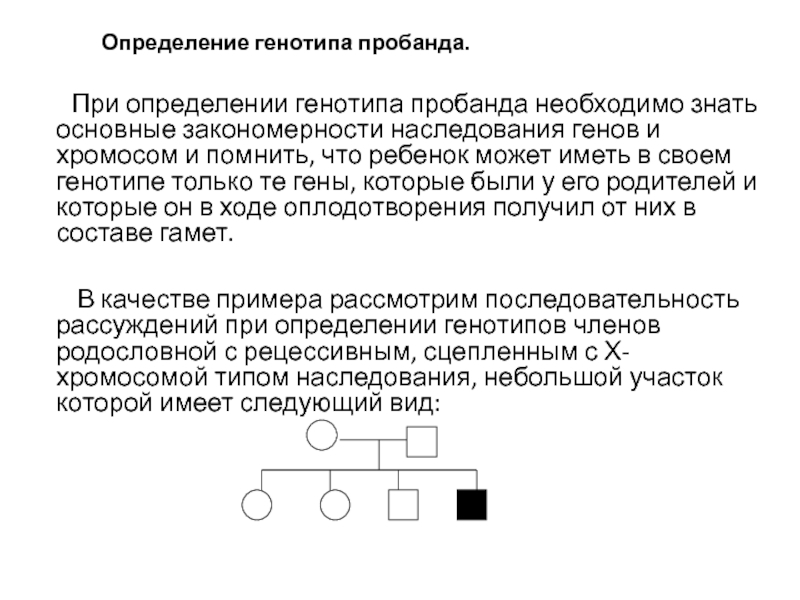 При определении генотипа пробанда необходимо знать основные закономерности наследования генов и хромосом и помнить, что ребенок может иметь в своем генотипе только те гены, которые были у его родителей и которые он в ходе оплодотворения получил от них в составе гамет.