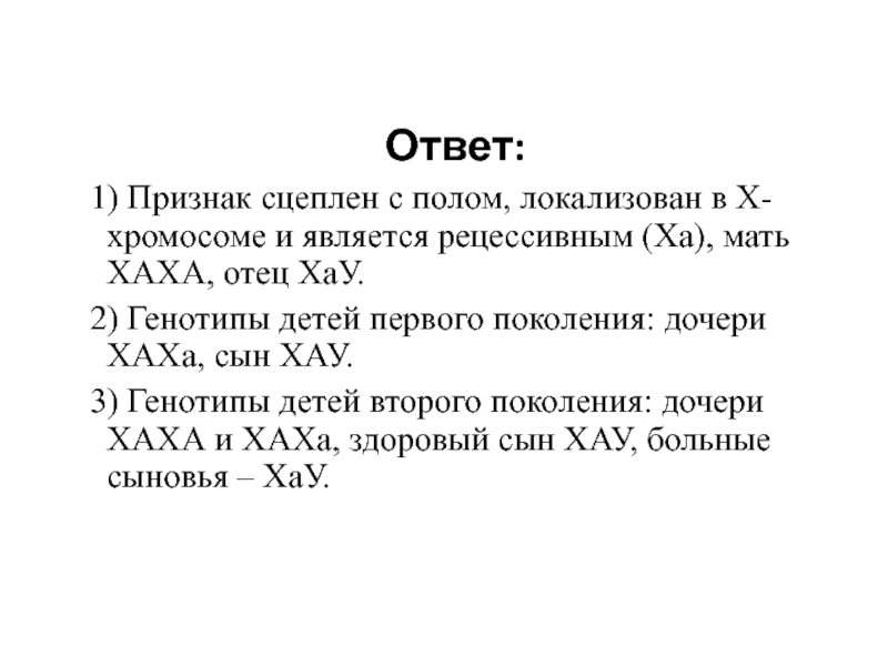 3) Генотипы детей второго поколения: дочери ХАХА и ХАХа, здоровый сын ХАУ, больные сыновья – ХаУ.