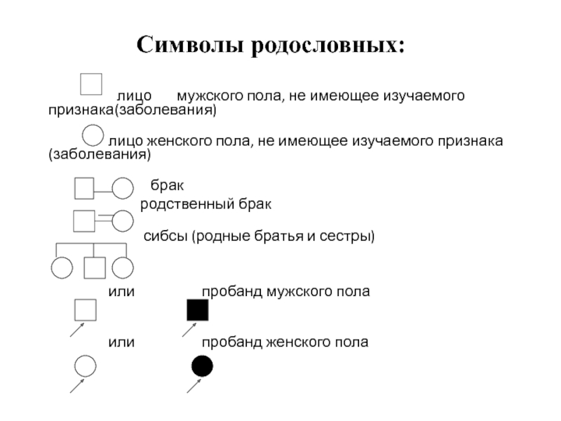 Пробанд – это лицо, родословную которого необходимо составить. Чаще всего пробандом является больной или носитель изучаемого признака. При составлении родословной сначала делают краткую запись о каждом члене родословной с точным указанием его родства по отношению к пробанду. Затем для наглядности готовят графическое изображение родословной. При этом пользуются стандартными символами. Все индивидуумы в родословной располагаются по поколениям, причем каждое поколение занимает в родословной отдельную строку. Поколения обозначаются римскими цифрами, которые ставятся сверху вниз слева от родословной. Братья и сестры располагаются в родословной в порядке рождения. В пределах одного поколения члены родословной обозначаются арабскими цифрами.