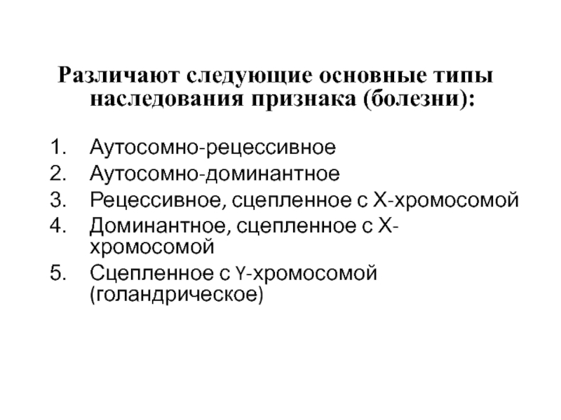 Слайд 6Различают следующие основные типы наследования признака (болезни):