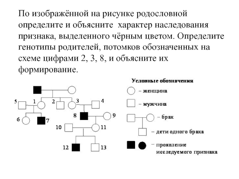 Слайд 32По родословной, представленной на рисунке, установите характер наследования признака, выделенного черным