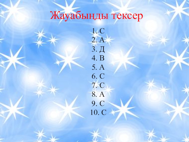 Жауабыңды тексер1. С    2. А3. Д4. В5. А6. С7. С8. А9. С10. С