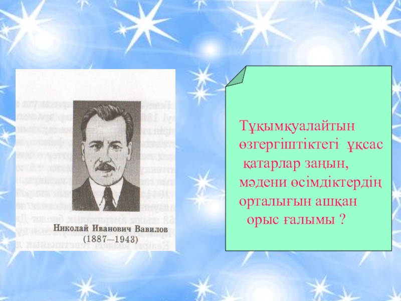 Тұқымқуалайтын өзгергіштіктегі ұқсас қатарлар заңын,мәдени өсімдіктердің орталығын ашқан орыс ғалымы ?