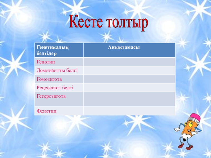 Слайд 2Мақсаты : Оқушыларды гибридологиялық зерттеу әдісімен, генетикалық ұғымдармен және терминдермен таныстыру.Генетикалық ұғымдардың